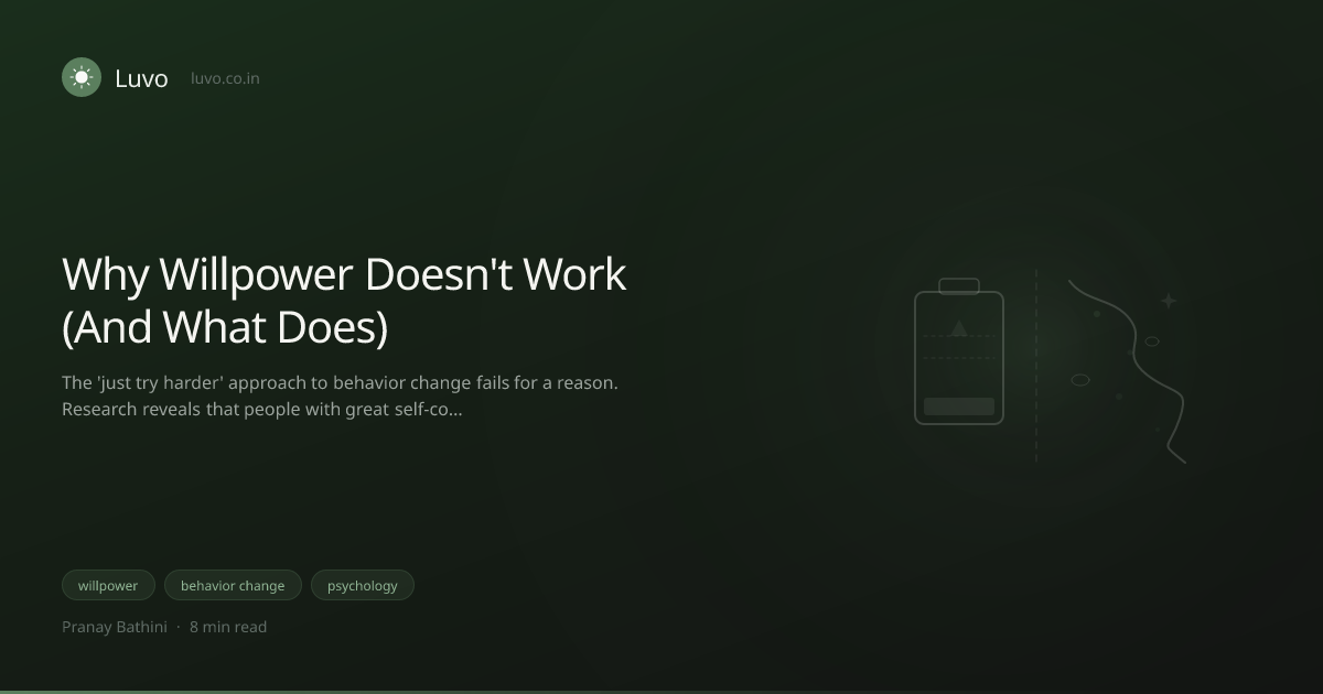The real insight: willpower isn't a muscle to strengthen. It's a backup generator: expensive to run, unreliable under load, and meant to be used sparingly. The goal isn't to build a bigger generator. The goal is to design your house so the power rarely goes out.