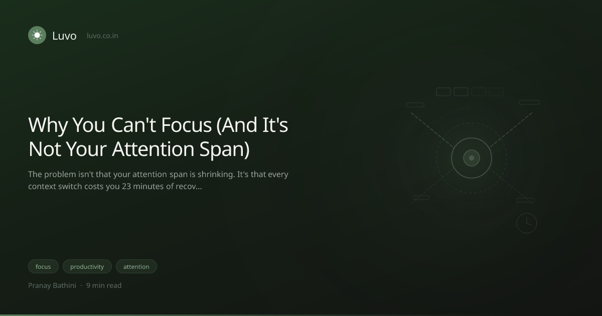 Pre-load your decisions before the focus block begins. A huge chunk of the activation energy problem is deciding what to focus on. If you sit down and spend ten minutes figuring out where to start, you've already burned working memory on planning instead of executing. This is why Luvo's Daily Intention exists — naming the one thing you'll focus on before the day's chaos begins. It sounds almost too simple, but it eliminates the switching temptation at its root. When you've already declared what today's priority is, the mental negotiation of "idi cheyyala, adi cheyyala?" (should I do this or that?) stops before it starts.